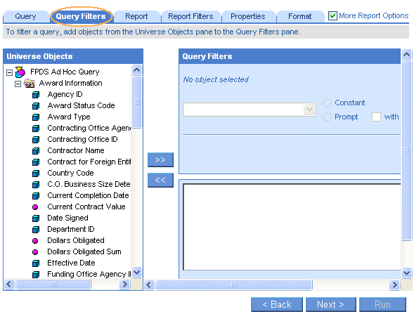 Next button – advances to the Query Filters tab where you can define filters to limit the data returned to the report.