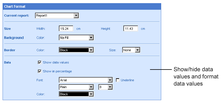 If the selected chart is a pie chart and you want to display the data values as percentages, select Show in percentage.