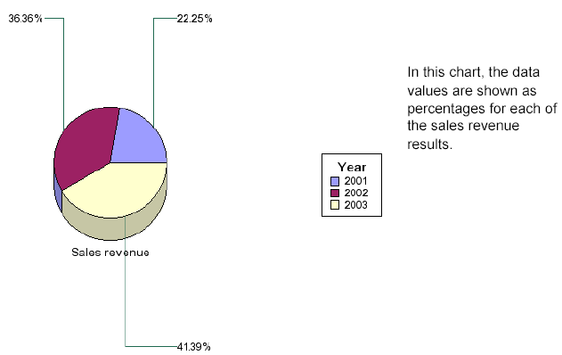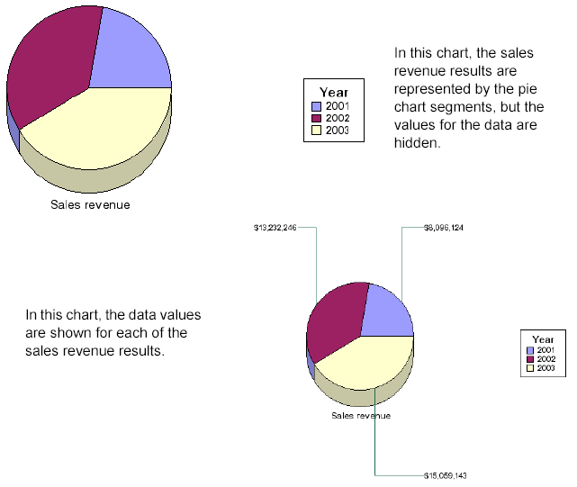Showing the data values is particularly useful for pie charts because, unlike bar, line, and scatter charts, pie charts have no axis scale. The following illustration shows two versions of the same 3D pie chart. The first version has the data values hidden. The second version has the data values shown.