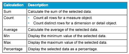 You can include predefined calculations in tables to include standard business calculations on the data they contain.