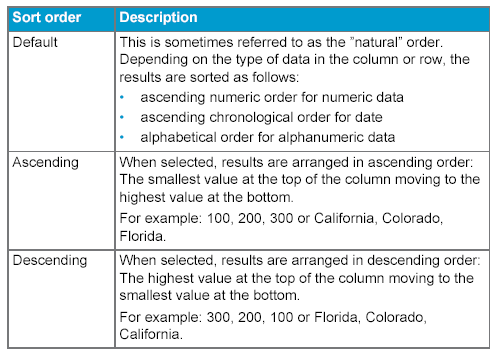 You can apply sorts to the values displayed in tables and sections to organize the order in which values are displayed in a report.