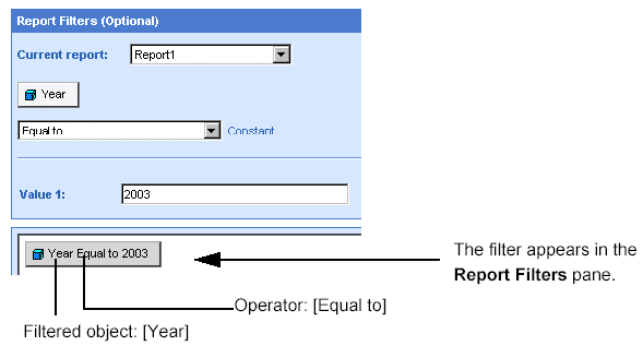 You specify each of these three elements when you create a filter. The figure below shows a filter that filters a report so that only values for the year 2003 are displayed: