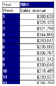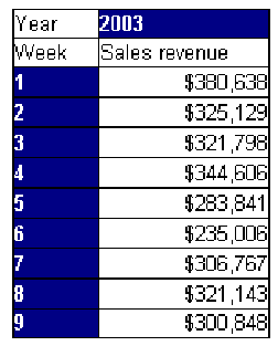 When you run the report again, WebIntelligence displays the range of values for the weeks you specified in the filter, for the year 2003.