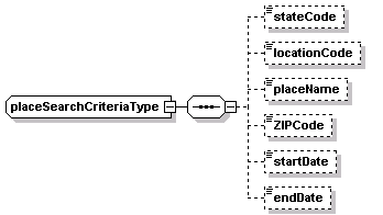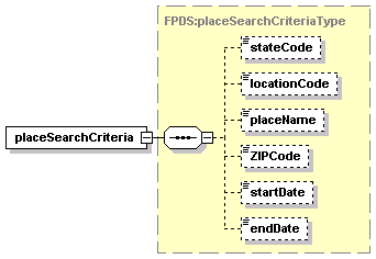 | source | <complexType name="placeSearchCriteriaType"> <sequence> <element name="stateCode" type="FPDS:stateType" nillable="true" minOccurs="0"/> <element name="locationCode" type="FPDS:locationCodeType" nillable="true" minOccurs="0"/> <element name="placeName" type="FPDS:placeNameType" nillable="true" minOccurs="0"/> <element name="ZIPCode" type="FPDS:ZIPCodeType" nillable="true" minOccurs="0"/> <element name="startDate" type="FPDS:FPDSDateType" nillable="true" minOccurs="0"/> <element name="endDate" type="FPDS:FPDSDateType" nillable="true" minOccurs="0"/> </sequence> </complexType> |