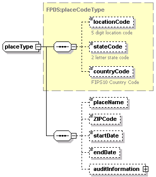 | source | <complexType name="placeType"> <complexContent> <extension base="FPDS:placeCodeType"> <sequence> <element name="placeName" type="FPDS:placeNameType" nillable="true" minOccurs="0"/> <element name="ZIPCode" type="FPDS:ZIPCodeType" nillable="true" minOccurs="0"/> <element name="startDate" type="FPDS:FPDSDateType" nillable="true" minOccurs="0"/> <element name="endDate" type="FPDS:FPDSDateType" nillable="true" minOccurs="0"/> <element name="auditInformation" type="FPDS:auditInformationType" nillable="true" minOccurs="0"/> </sequence> </extension> </complexContent> </complexType> |