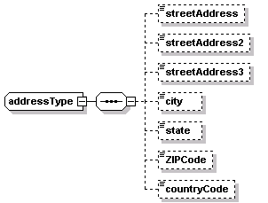 | source | <complexType name="addressType"> <sequence> <element name="streetAddress" type="FPDS:streetAddressType" nillable="true" minOccurs="0"/> <element name="streetAddress2" type="FPDS:streetAddressType" nillable="true" minOccurs="0"/> <element name="streetAddress3" type="FPDS:streetAddressType" nillable="true" minOccurs="0"/> <element name="city" type="FPDS:cityType" nillable="true" minOccurs="0"/> <element name="state" type="FPDS:stateType" nillable="true" minOccurs="0"/> <element name="ZIPCode" type="FPDS:ZIPCodeType" nillable="true" minOccurs="0"/> <element name="countryCode" type="FPDS:countryCodeType" default="USA" nillable="true" minOccurs="0"/> </sequence> </complexType> |