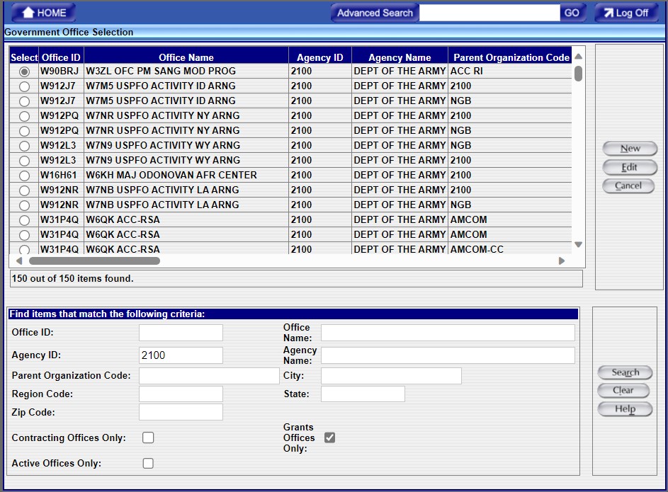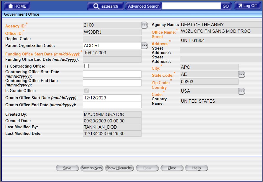 The Government Office screen allows designating a Funding Office as a Grants Office and associating Start and End Dates with the newly-named Grants Office, thereby making it active for a given time period. (This is allowed only for DoD and not Civilian agencies.)