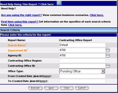 Note : In this report, the orange letter fields with an * are required, and the black letter fields are optional. If you would like to narrow your search, enter data in the optional fields. This generates specific data based on your search criteria. Examples of the search criteria screen for this report is shown below.