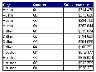You are the regional sales manager in Texas. You receive a report showing 2003 annual revenue for stores in your region, broken down by cities and quarters.